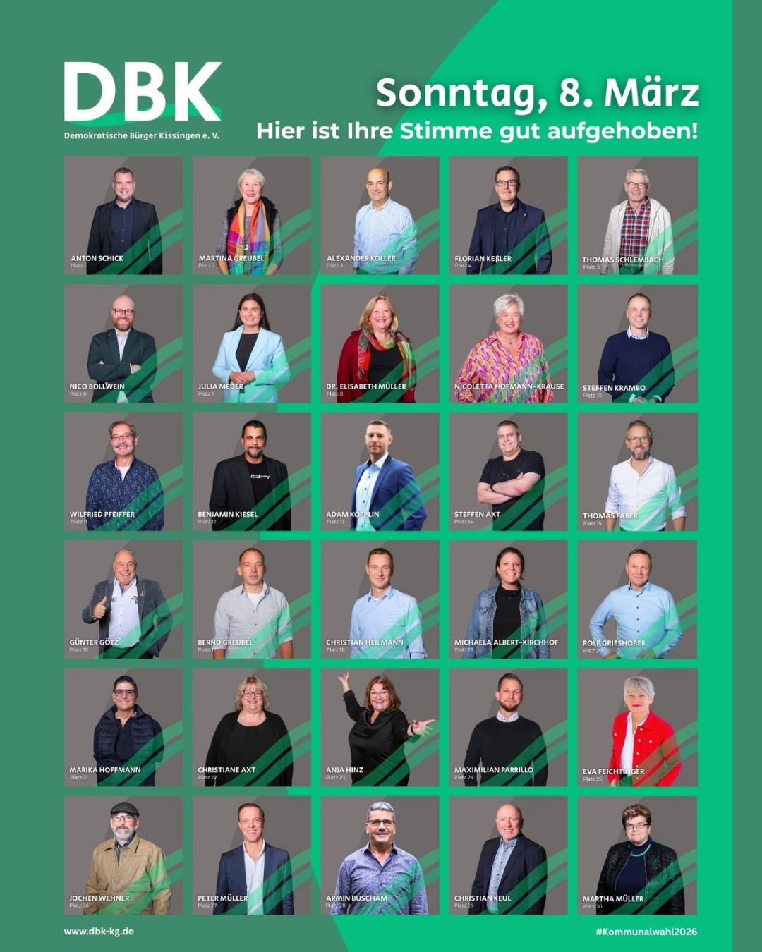 Die DBK-Liste vereint erfahrene und neue Gesichter – Menschen aus unterschiedlichen Berufs- und Altersgruppen, die sich gemeinsam für eine moderne, bürgernahe und lebenswerte Stadt einsetzen wollen.
